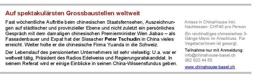 Teilnahme nur mit Anmeldung: info@chinahouse-basel.ch oder 062 922 44 55